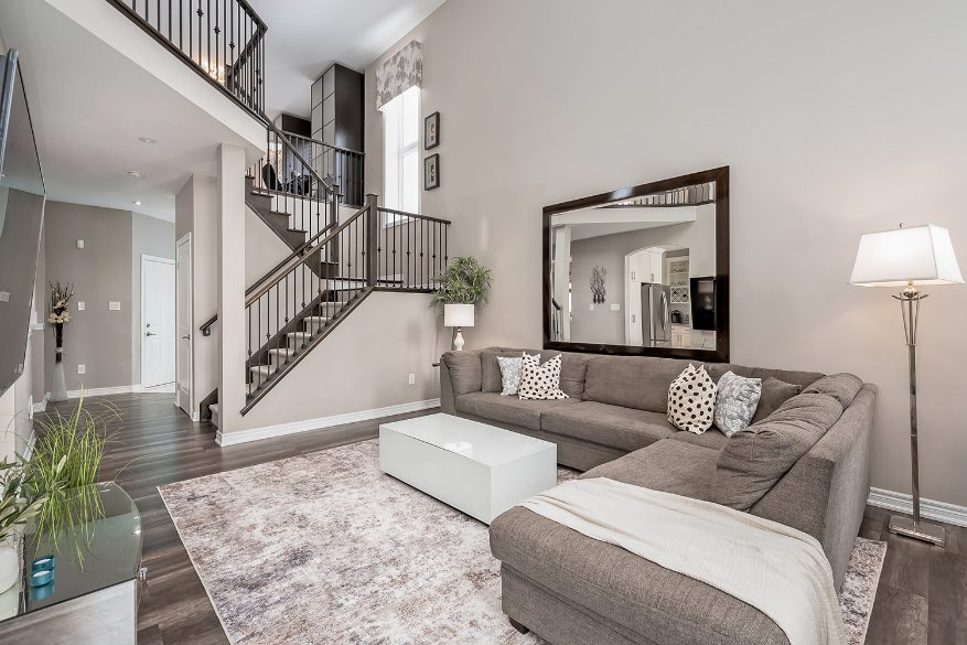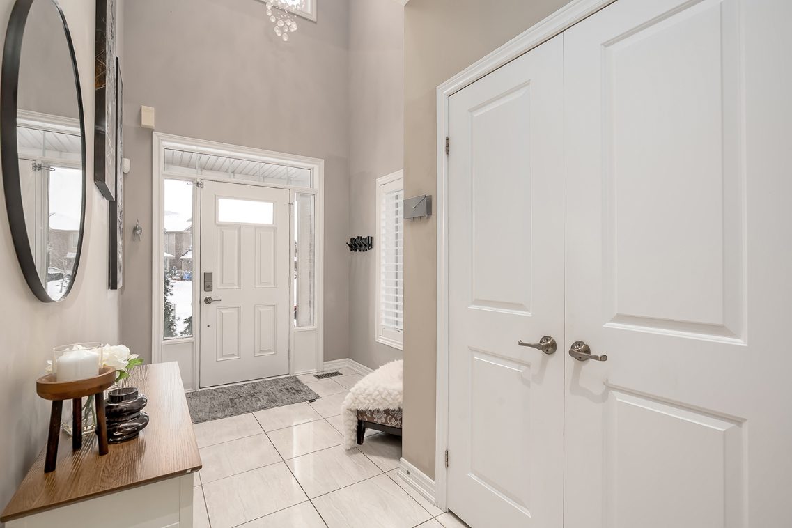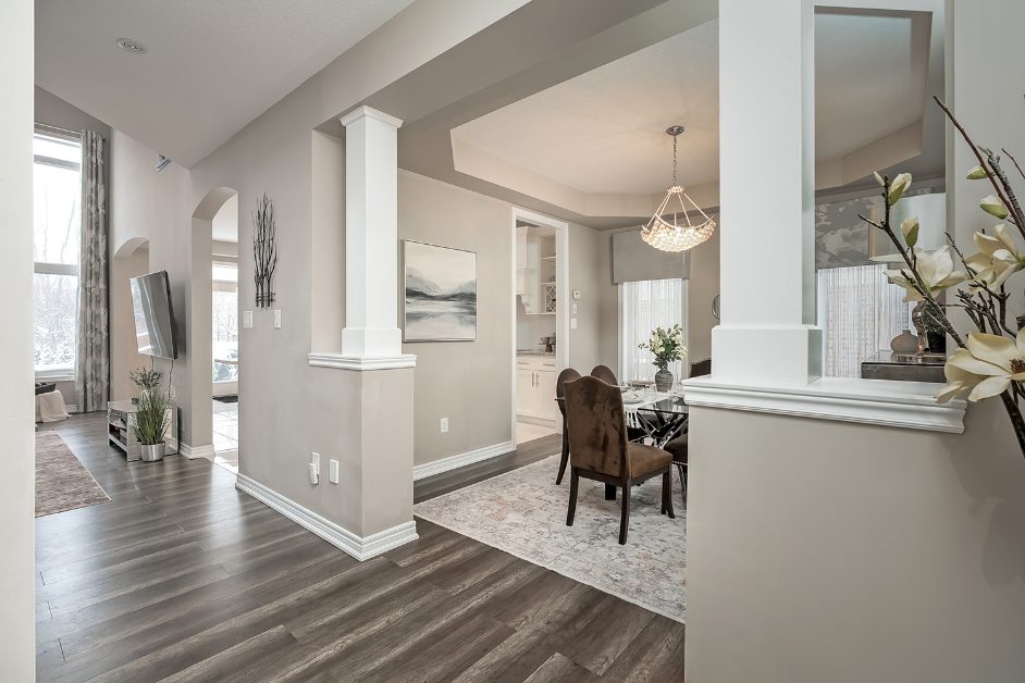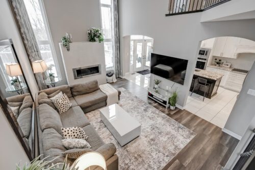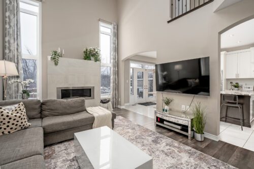 Inside, the main floor impresses with soaring vaulted ceilings, a custom fireplace, and expansive windows framing serene backyard views. A formal dining room flows seamlessly into the upgraded chef’s kitchen, featuring custom cabinetry, stainless steel appliances, a functional island, and ample storage – enhanced beyond the original builder’s plan. Convenient backyard access makes indoor-outdoor living effortless.