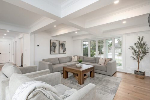The main floor impresses immediately with rich hardwood floors, a gas fireplace flanked by custom built-ins, and coffered ceilings that add a timeless architectural touch to the living space. The custom kitchen is a true showpiece, featuring quartz countertops and a seamless connection to a generous dining area, ideal for both entertaining and everyday family life.