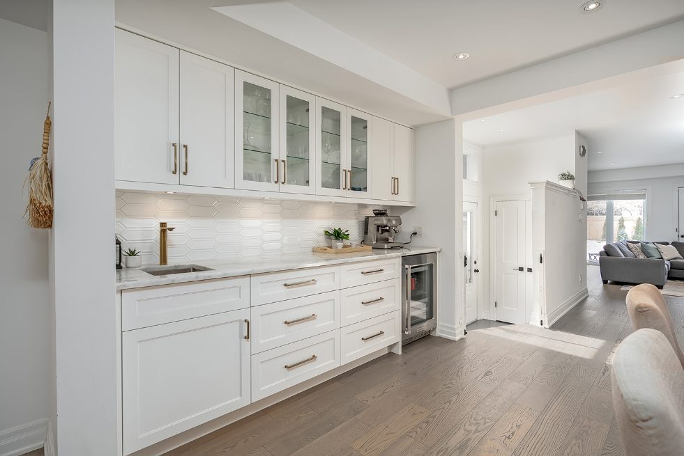 The covered front porch welcomes you with warmth and charm, the perfect place to enjoy your morning coffee or unwind in the evening. A true bonus for downtown living, the home offers parking for four vehicles, including one in the garage and three on the private driveway. Inside, rich hardwood flooring flows throughout, creating an elegant and cohesive feel. The custom-designed kitchen is the heart of the home, featuring premium finishes, abundant cabinetry, and a layout ideal for everyday living and entertaining. A dedicated coffee bar with its own sink adds convenience and character.
