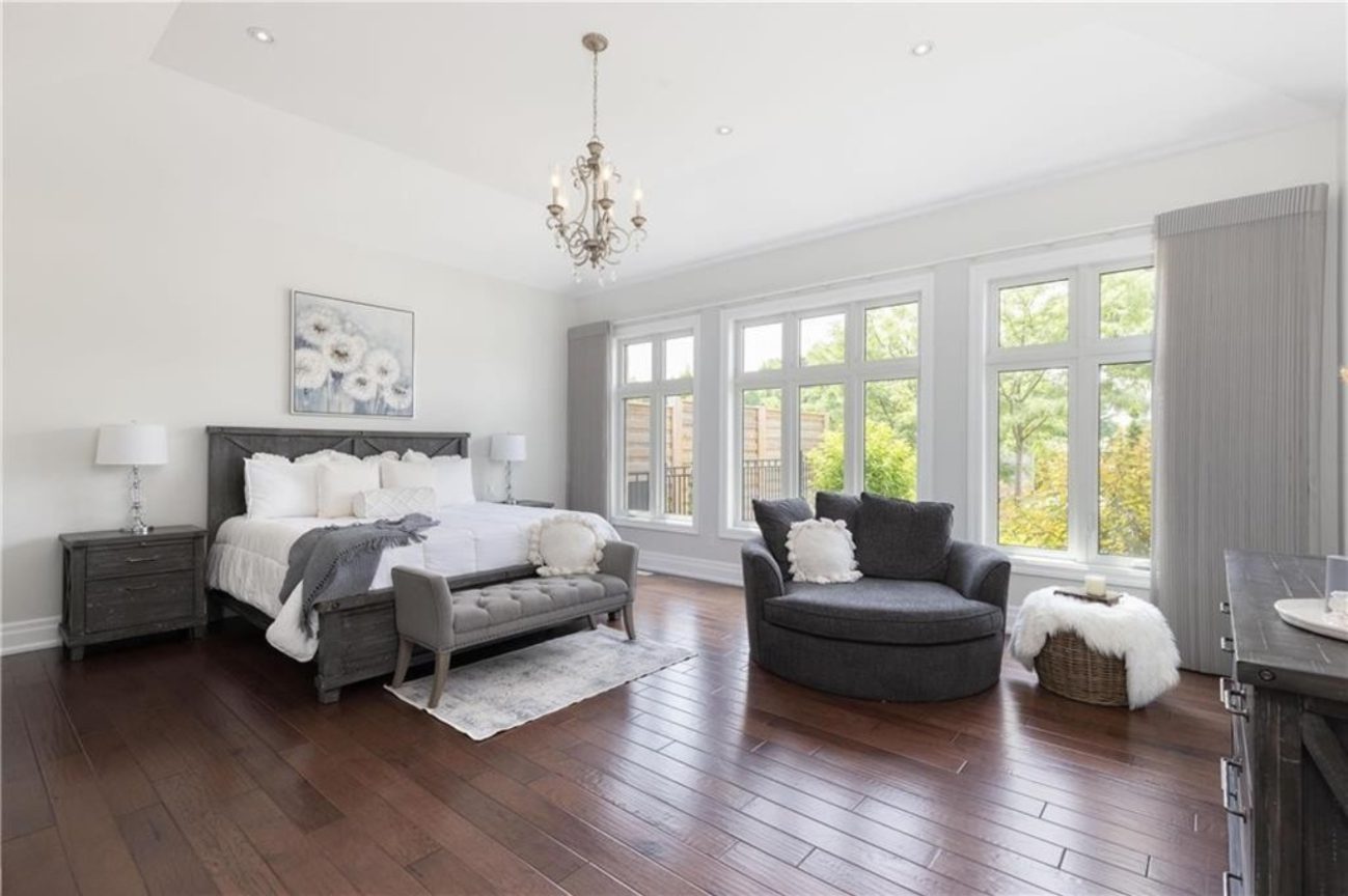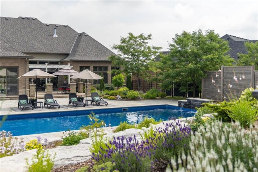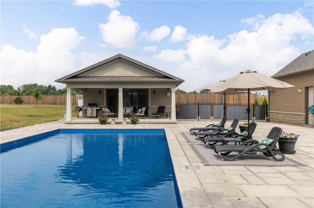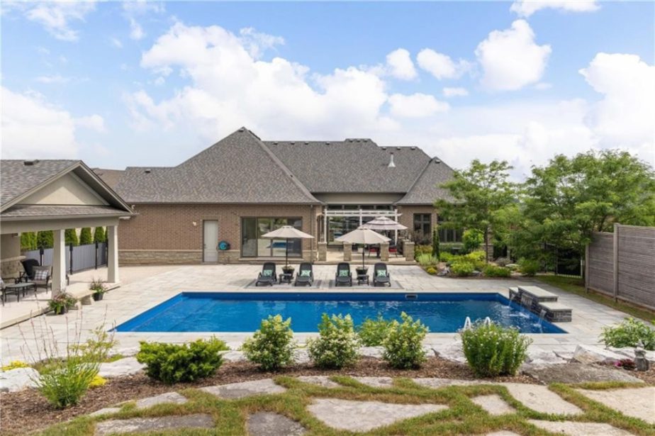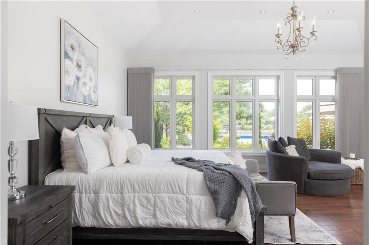 An unparalleled estate residence in the heart of Dundas’ most prestigious enclave. Poised on a pristine, professionally manicured two-acre lot backing directly onto the protected conservation lands of Tews Falls, this extraordinary bungalow offers over 4,000 square feet of exquisite main floor living, meticulously crafted with the finest materials and finishes available. Every element of this home speaks to luxury and sophistication. Dramatic coffered ceilings soaring from 10 to 18 feet frame the interior with architectural distinction, while expansive principal rooms flow effortlessly under a canopy of custom millwork, oversized baseboards, detailed crown mouldings, and designer lighting. The heart of the home is the gourmet chefs kitchen, an entertainers dream complete with top-tier appliances, bespoke cabinetry, an oversized island, and a fully outfitted walk-in pantry, all opening to the magnificent great room with its sweeping views of the lush grounds beyond. Offering 4 spacious bedrooms on the main level, including an opulent primary suite. With dual walk-in closets, a spa-like ensuite, and tranquil views of the rear gardens, it is a private retreat of the highest order. An additional fifth bedroom is located in the fully finished lower level, which has been designed as a self-contained suite with its own full kitchen, bath, and living area ideal for extended family or guests. The rear yard is a resort-caliber oasis, featuring a heated in-ground pool, elegant cabana, your own putting green, mature trees and conservation views. A four-season sunroom invites year-round enjoyment of the surrounding nature, while four garage bays provide ample room for automotive enthusiasts. The lower level is finished to the same exceptional standard as the main floor, with wide-plank flooring, designer tilework, custom built-ins, and premium fixtures throughout. Recently, the property has undergone numerous high-end upgrades, further enhancing its already impeccable quality.